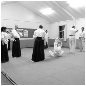 A pair of wide, pleated, black trousers called a hakama may also be worn. In many styles its use is reserved for the black belt ranks, whilst others allow all practitioners or female practitioners to wear a hakama regardless of rank. Here at Harrow Aikido Club, a hakama may be worn after achieving the second grade - 4th Kyu or Orange belt.